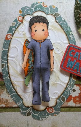 I punched the bottom sentiment area with EK Success Real Estate Sign punch. The edges are inked with Vintage Photo Distress Ink. The chocolate pearls are from CTMH. I painted the wooden knob with blue acrylic paint and glued it to the front of the drawer using my favorite glue---FABRI-TAC. It's awesome and holds extremely well. It's like hot glue in a bottle!